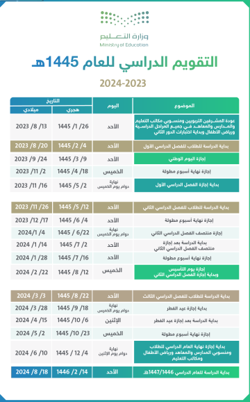 التعليم السعودي تعلن موعد الاختبارات النهائية 1445 الفصل الأول تحدد تاريخ العودة للمدارس الفصل الثاني