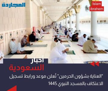 “العناية بشؤون الحرمين” تُعلن موعد ورابط تسجيل الاعتكاف بالمسجد النبوي 1445 عبر تطبيق زائرون